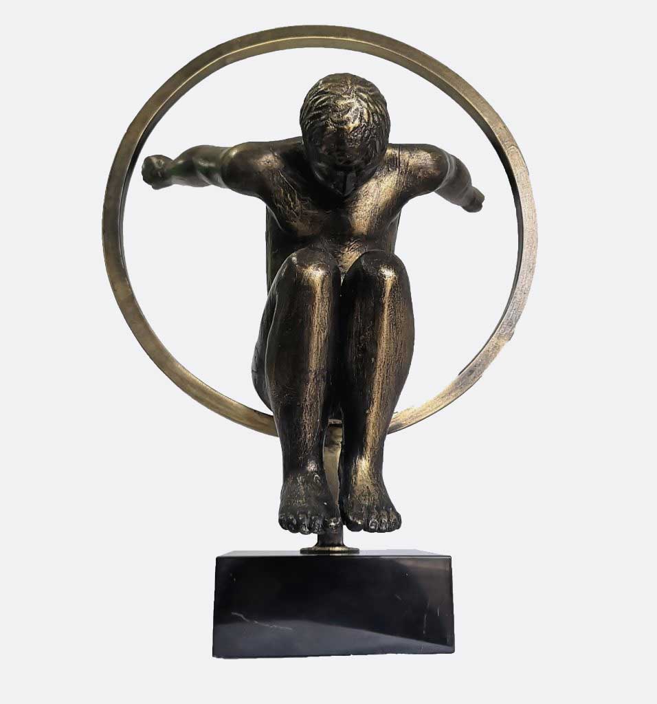 Soberbia escultura captando el movimiento de nuestros cada vez más talentosos trapecistas. Combinando el aro de fierro con base de resina y mármol logran la base perfecta para la figura en cerámica con patina de bronce.