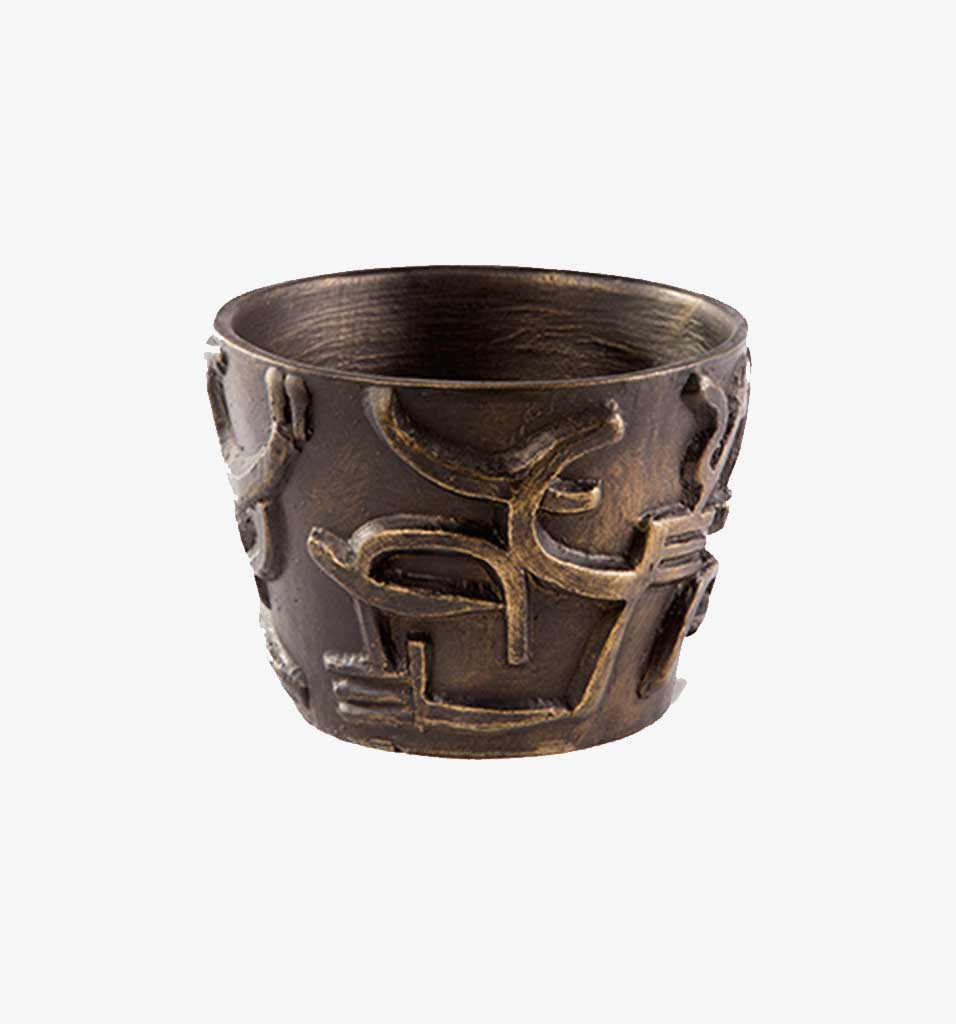 Maceta de barro con diseño de glifos étnicos con pátina de bronce.